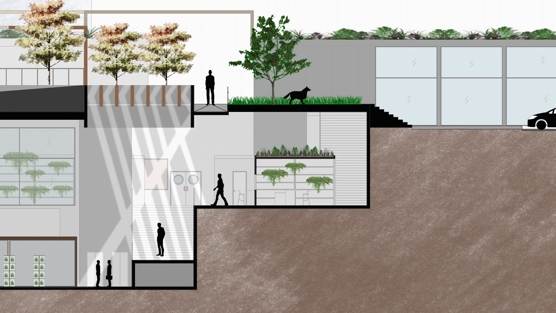 The program first creates a bustling urban square that offers a walk on the roofs of the building, a farmer's market that combines various stalls and 'farm to table' style cooking workshops, and a faculty of agriculture that actually helps the market. In addition to the faculty's needs, there is a need for an educational library, so the library is also connected to a public library that serves the rest of the community.